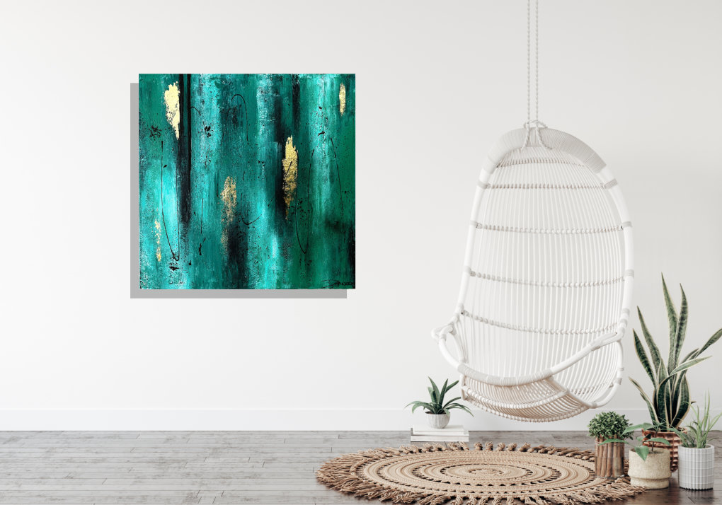 Dieses abstrakte Acrylgemälde "green & gold" ist ein handgemaltes Acrylbild in der Größe 80 cm x 80 cm und ein echter Blickfang in jedem Wohnzimmer oder Arbeitszimmer.